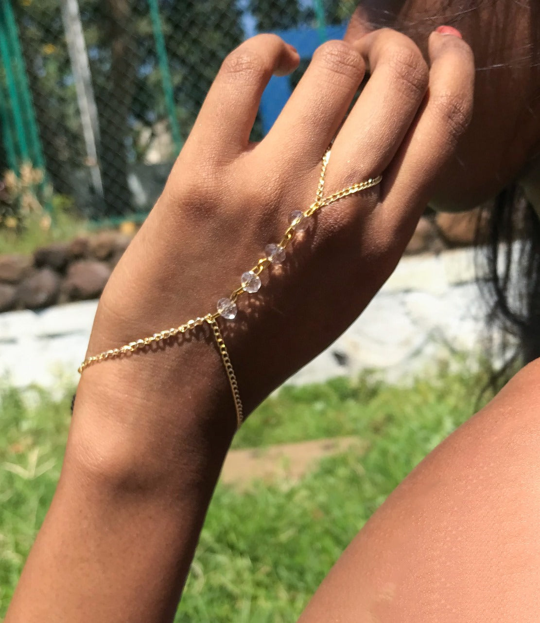 Crafted with love, This golden ring bracelet is studded with clear beads, and effortlessly tied with a stunning golden chain. Perfect for those summer outfits.