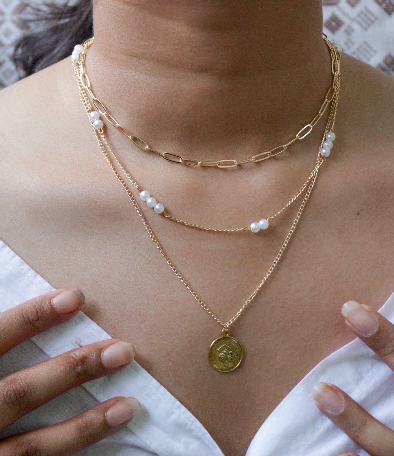 The three-layered Gauhar necklace combines delicate gold chains, white pearls, and an embossed coin pendant, a versatile piece for elegance and modern style.