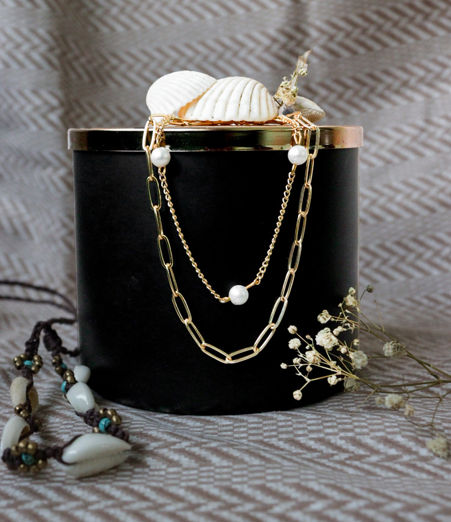This two-layered anklet combines a bold chain with white pearls. Wear it confidently to elevate your look with elegance and modern charm.